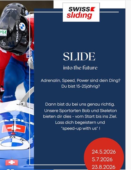 Kadereinteilung Saison 2026/2027 2. April 2026 Nach dem Motto «Nach der Saison ist vor der Saison» erfolgt bei Swiss Sliding jeweils im Frühjahr die Neueinteilung der Athletinnen und Athleten in die verschiedenen Kaderstufen. Grundlage dafür bilden sowohl die athletischen Leistungen als auch die Resultate während der Saison. Klicken Sie auf «weiter», um die gesamte Kadereinteilung zu sehen. Weiter